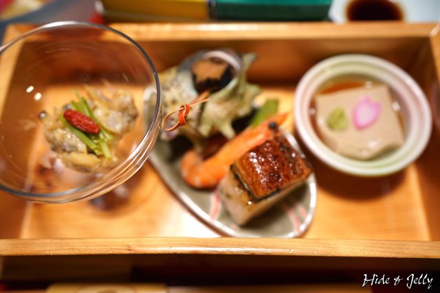 前菜的四種盛合,由右至左是胡麻豆腐、鰻魚握壽司、蠑螺、胡麻沙拉等。