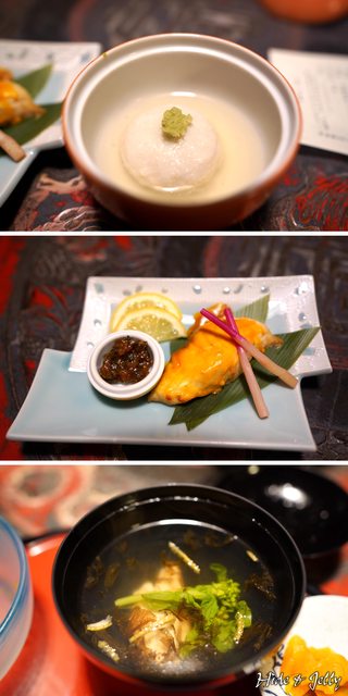 再來三道菜是由上至下依序是野菜饅頭、天然櫻鯛海膽燒、黑喉清湯,其中天然櫻鯛海膽