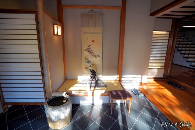 寬廣的玄關,放著大黑天的木雕與七福神的畫軸,與暖陽灑進來的日光一點都不違和。
