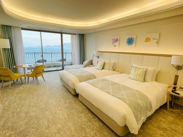 房間是豪華雙床房型,房間寬敞舒適且有整片落地窗海景可俯瞰整個唐津灣及唐津名勝虹 之松原。 (而且很開心有被升等原本買的專案綁定是三樓,可能那天人不多飯店給我們六樓的房型 )