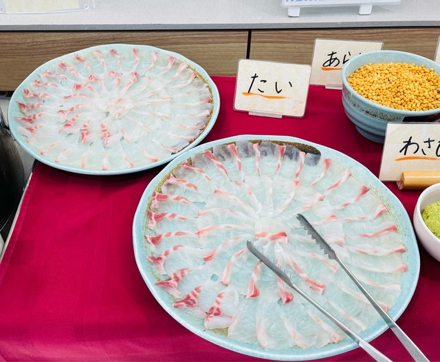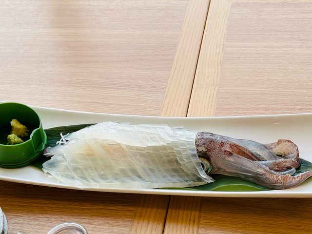 也有男、女湯不過不能拍照攝影,蒸氣室我沒拍到。 晚上是吃飯店的buffet 很豐盛當地名產都有。 一入座沒多久就送上唐津名產呼子烏賊生魚片一隻,兩人一隻、四人兩隻以此類推,吃一 半會拿去炸成天婦羅再送上來。 生的時候我真不敢吃,因為還在動…