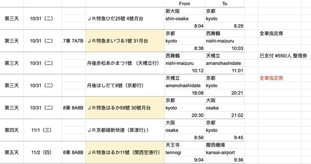 目前排好預計搭乘的列車,會搭配使用關西廣域周遊券(在JR西日本官網購買)。因為第一次自己出國,所以想說盡量在出國前將能安排好的都安排好。