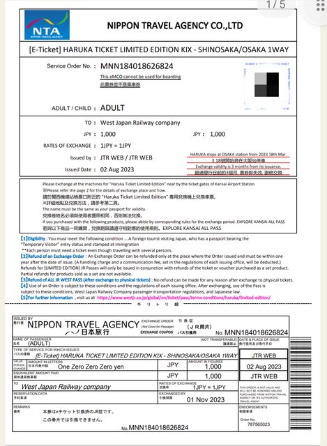 標題[讓售] HARUKA單程票(機場→大阪/新大阪)*2