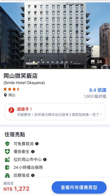 推 matsui07 : 岡山的微笑飯店看起來又新又好 在山口住過一次微笑 10/24 09:36
