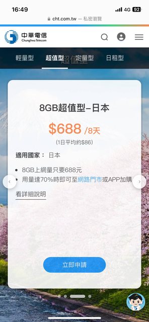 → superhider : 去日本辦電信原號漫遊最方便,我去玩都是用中華APP 11/01 16:13