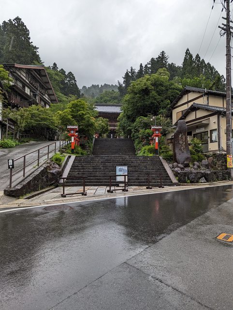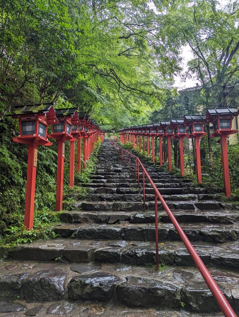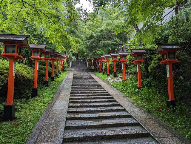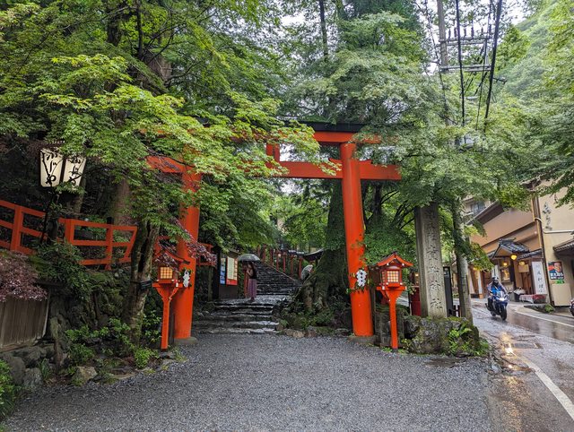 離開賀茂神社後回到神社入口旁的出町柳站,準備搭叡山電鐵上貴船 午餐吃了車站內的LOTTERIA,便宜又好吃的速食店 吃完之後就搭乘電鐵到貴船口,受到梅雨鋒面影響午後又開始下起雨了 到貴船口離貴船神社還有一段距離,幸好有公車可以搭 可能是下雨的關係觀光客意外的少,雨中的神社氣氛相當不錯