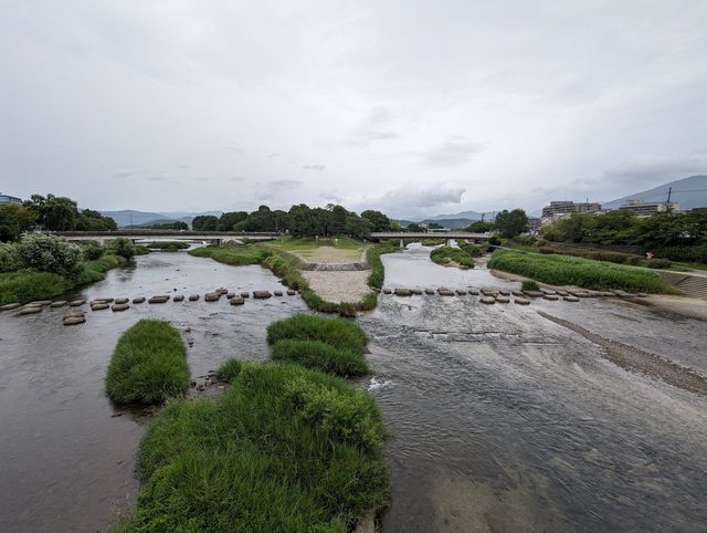 之後往另一個方向前往賀茂神社 經過賀茂大橋可以看到遠處河床上的石頭,是個有名的戲水處