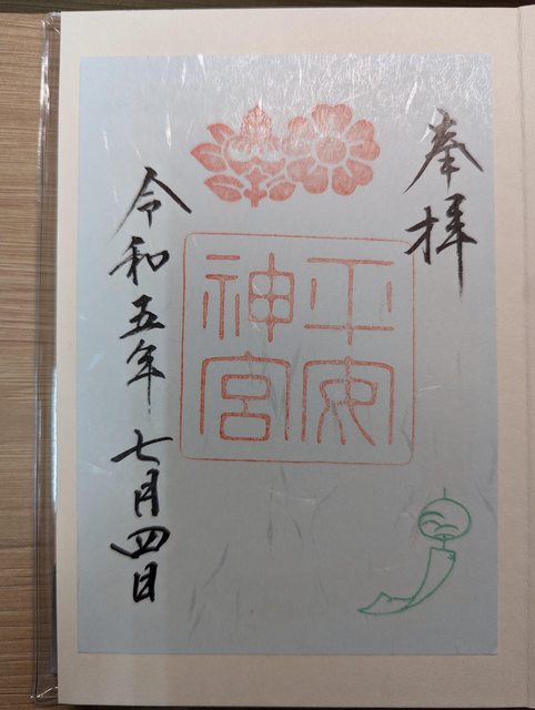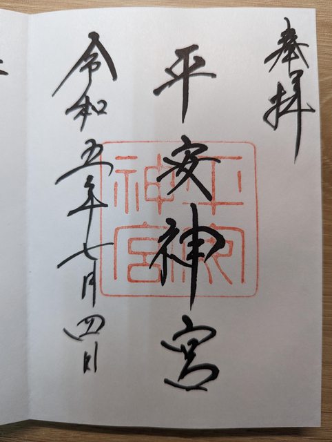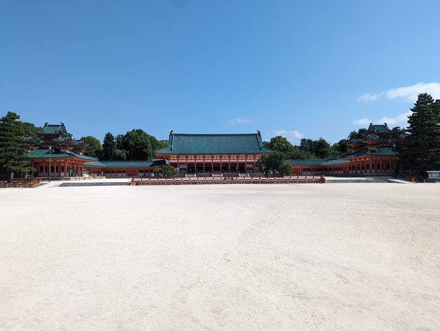 巨大紅色鳥居相當壯觀,參道也相當寬闊 通過正門後是一遍白沙地,很少有占地如此廣闊的神社 這裡供奉的是桓武天皇,紀念千年前遷都平安京 收集到兩個朱印
