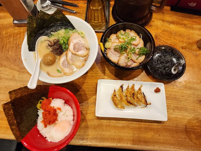 我點了豚骨拉麵、叉燒、明太子飯、十顆煎餃,這樣才2850日圓,很滿足。