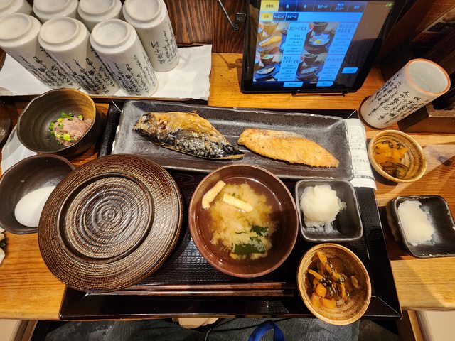 田車站附近的しんぱち食堂 田町店。點餐用前面的平板點餐,我點的是鮭魚跟鯖魚兩個