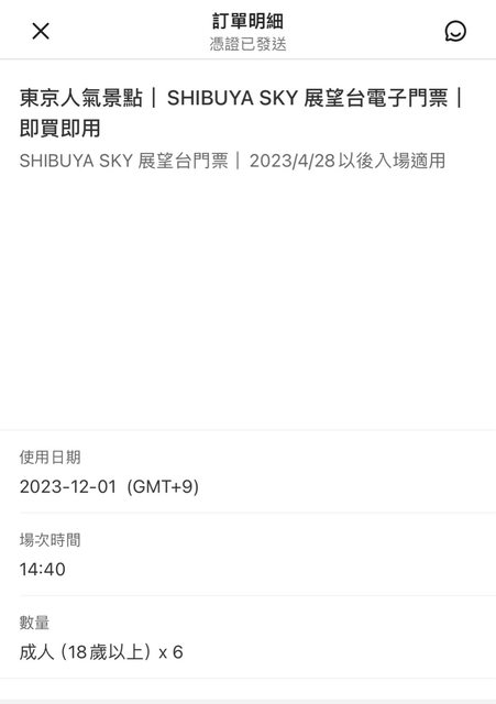 Shibuya sky 門票(12/1 14:40入場)兩張