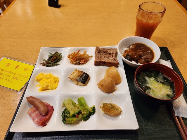 早餐種類多,有鮭魚卵、生魚片、湯咖哩。
