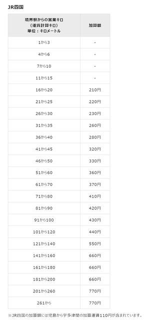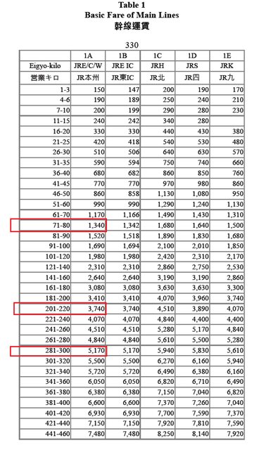 根據區間距離,JR的票價上升幅度會有所不同,以本州三社的幹線而言,