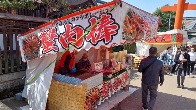 : : 八坂神社入口有很多小吃攤販.我吃過”蟹肉棒”、 “はしまき”,