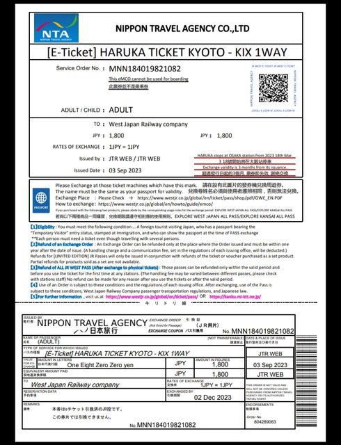 日本關西機場 KIX 機場快線 HARUKA 車票