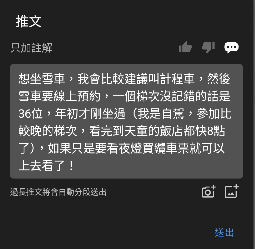 → KoowKyyyhsak: 二晚雪車一定得事先預約 不過至少交通情況心裡會有 12/02 23:54