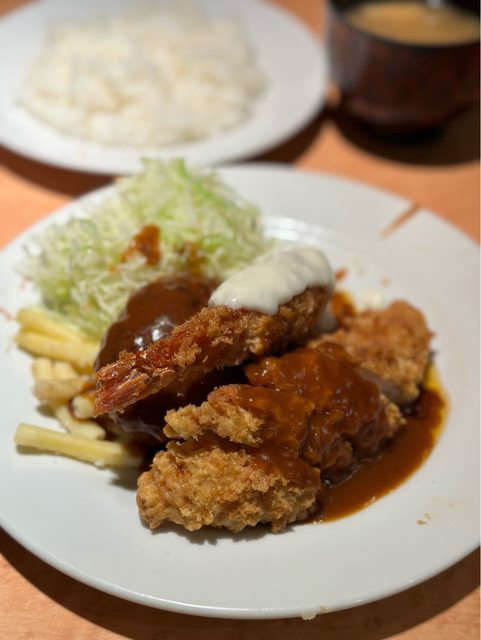 有漢堡排、炸蝦及炸雞胸肉,漢堡排非常厲害,有滿滿的肉汁,太迷人了~
