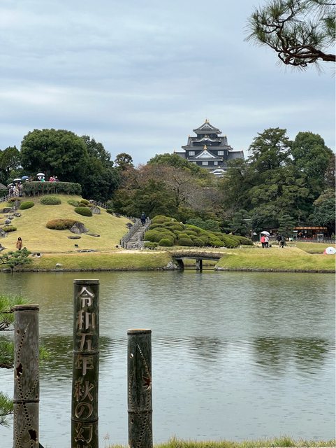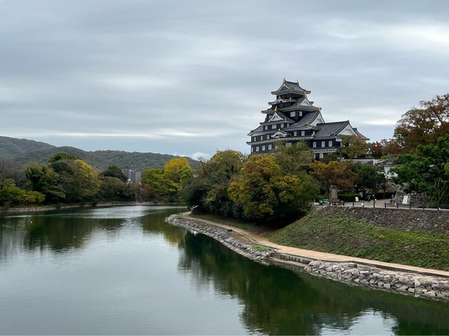 後樂園及岡山城中間以橋樑銜接,岡山城翻新後烏黑的外牆搭配金飾,有了「烏城」的美