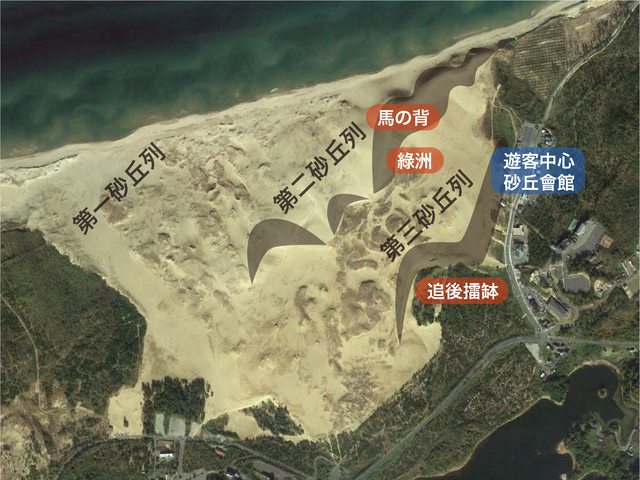 鳥取砂丘由海岸往內陸,由三群「新月連丘/橫沙丘」構成。第二砂丘列最為壯觀,包括