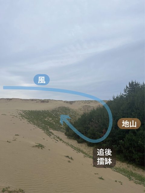鳥取砂丘休止角的最大值。成因是風遇到障礙物「地山」時發生反射,在障礙物的迎風面