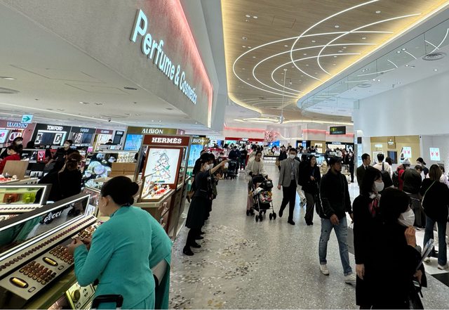 圍很寬,今天還不太需要排隊,接下來有餐廳、精品區,其中LV區域好大又氣派但我精品