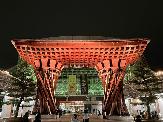 走回飯店,順路看看榮登世界最美麗車站之一的金澤車站,鼓門造型搭配打燈,在夜晚中