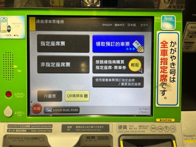 在金澤車站選擇可掃描護照的機台就可取票。先切換繁體中文,掃描雙K提供的QR code,