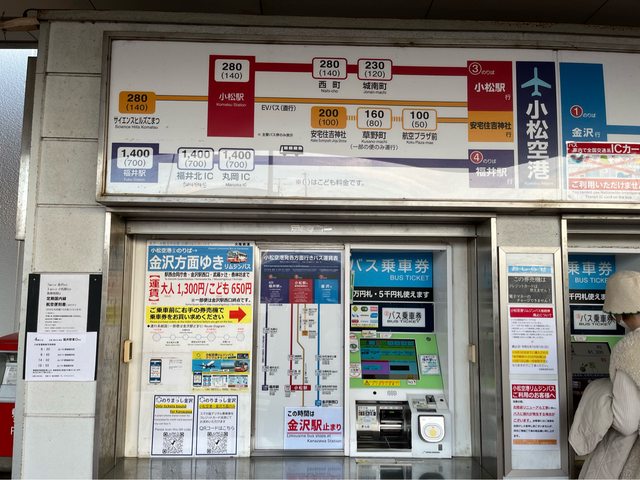 從機場往金澤站(1,300円)或小松站(280円)的巴士,都在出機場左手邊。當初查資料