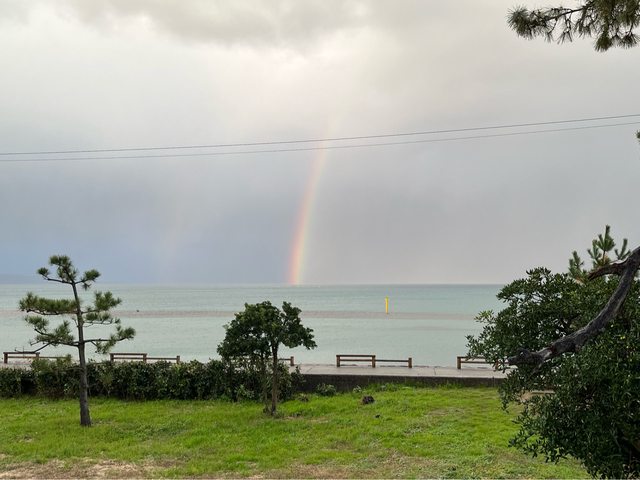 烏雲漸漸飄走、露出一抹藍天。走回車站等車時,幸運看到遠方的彩虹高掛。