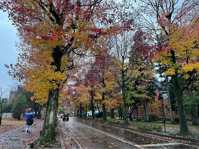 有一點雨勢,撐著傘經過石川縣政紀念迎賓館來到アメリカ楓通,這條美麗的林蔭大道種