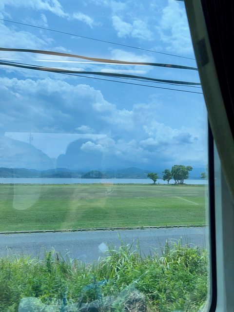 窗外左側可以見到湖山池。湖山池原先是一座潟湖,隨著海岸沙丘(湖山砂丘)的發育,