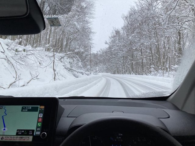 阿仁合往森吉山的10公里山路上,路邊積雪與結冰,後輪在起步,或TCS系統偵測打滑時