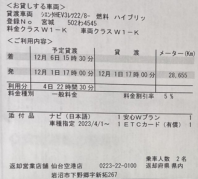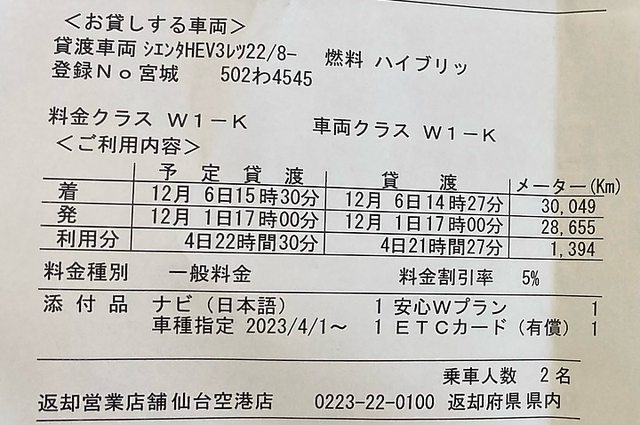 仙台機場TOYOTA租車歸還車子,這6天5夜跑1394公里,加油實測一公升22公里