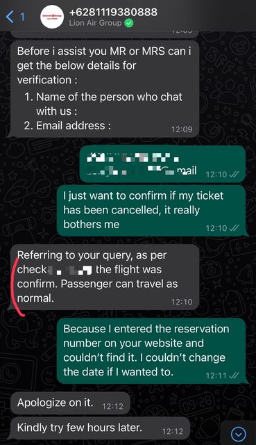 再來我也加入馬印的WhatsApp詢問真人客服,客服則回覆我,「航班沒有取消,旅客可以正常出遊,並且請稍後再上網站查詢」,直到今日,我仍然無法在馬印的官網查詢到我的訂單,依然顯示「Booking was cancelled already」