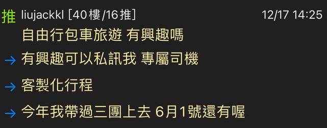 liujackkl於文章推文推銷自己包車旅遊,違反版規D