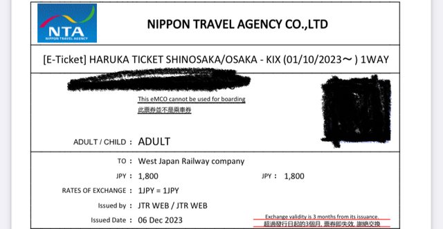 1. 讓售品項:大阪到關西機場haruka 1張單程票