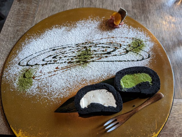 兩面微焦,再沾上甜醬油或是紅豆吃。生乳捲的擺盤也是個浮誇,不過味道我沒有太多印