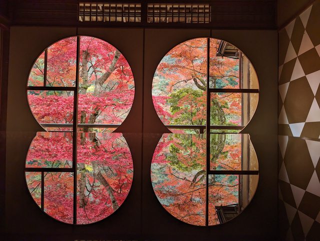 經過茶室,來到圓窗的房間。這個房間的窗戶是圓形的,所以拍起來的倒影效果滿有趣的