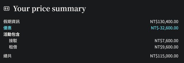五天四夜兩個人的總價是NT$115,000,平均一人一天NT$11,500,