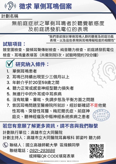 標題: [徵求] 實驗受測者 單側耳鳴個案 地點高雄