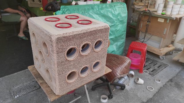 往旁邊一看,旁邊好幾座長得很奇怪的瓦楞紙屋