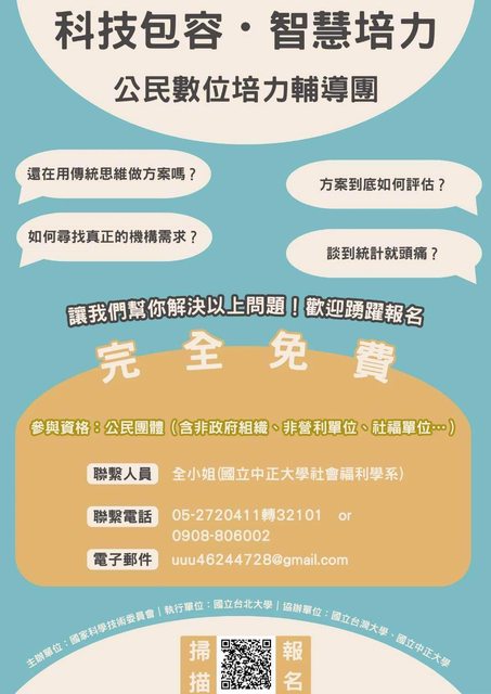就讓專業師資成為您們最有力的後盾吧!有興趣的公民團體趕緊填寫報名表單吧!