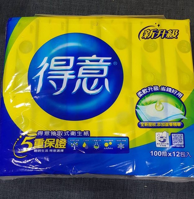 物品名稱:得意抽取式衛生紙100抽×120包入