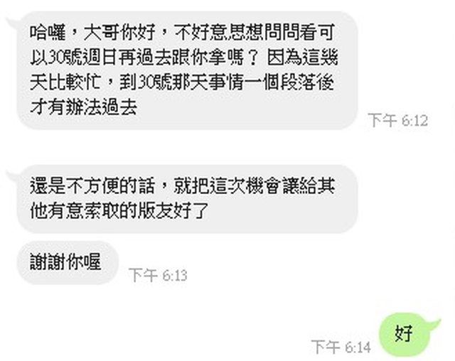 → lovetaiwanx : 原po詢問是否能約30號過去索取,或是就讓給其他有 07/23 09:35