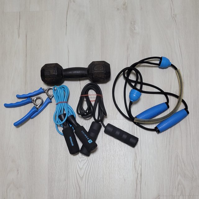 物品名稱:握力器*2/跳繩*2/啞鈴10磅/拉繩