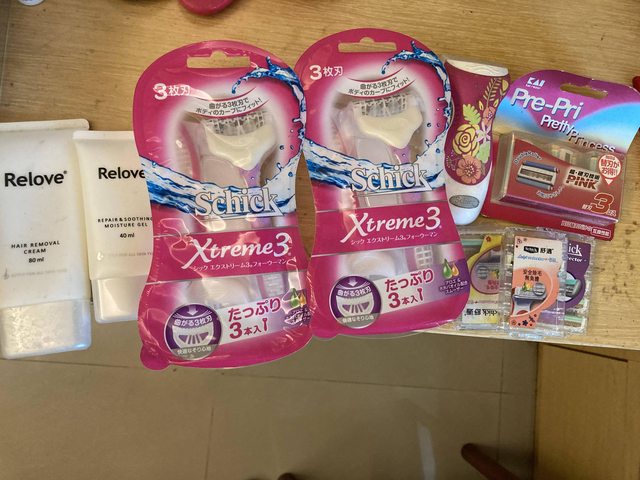 如照片。有除毛膏、除毛刀和刀片。有些是全新有些有用過,請一次全部索取。