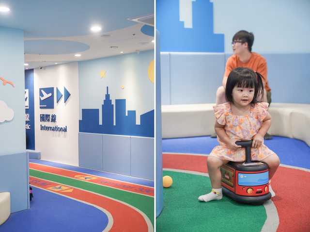 樓的遊戲室內,有著亮麗的飛機軌道、航空標示牌,連國內線國外線的大型標示都搬進來