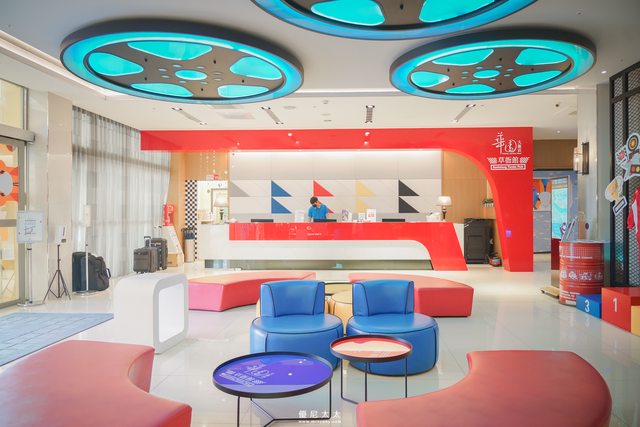 以賽車為主題的飯店外觀,搶眼的紅、白、黑、藍色建構出賽車色系,同時也呼應著旁邊