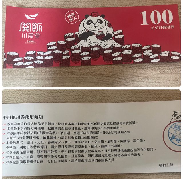 2. 物品名稱:開飯川平日抵用券