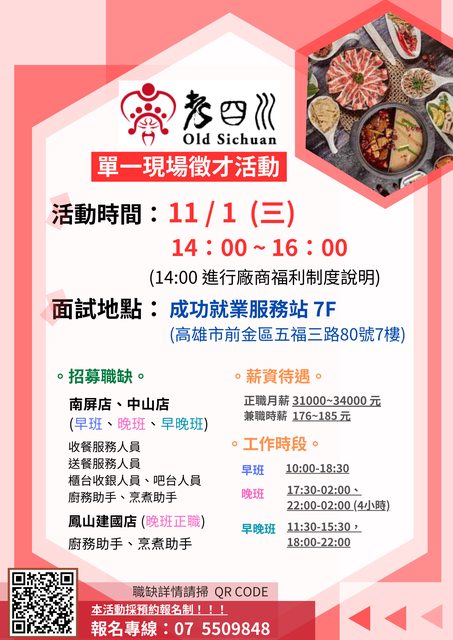 於11/1將辦理老四川麻辣鍋擴大徵才活動